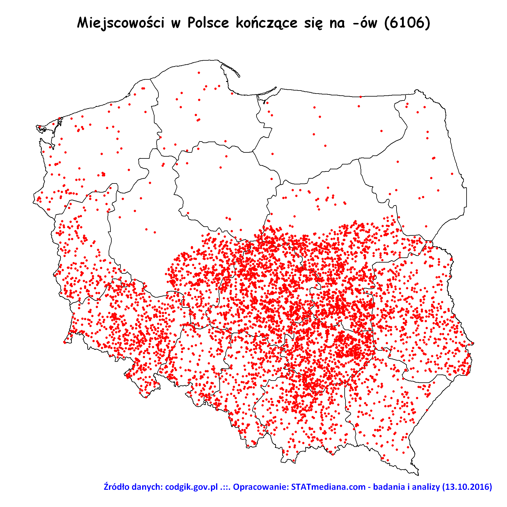 Końcówki miejscowości, których nazwy kończą się na ów pokazuje pierwsza mapa. Widać wyraźnie, że te miasta pojawiają się w Polsce środkowej i południowej, natomiast w niewielkim stopniu występują w Polsce północnej. Należy zwrócić uwagę na wyraźną granicę zagęszczenia miast i miejscowości zakończonych na ów. Przebiega ona przez obecne województwa: lubelskie, dolną połowę mazowieckiego, łódzkie, fragment dolnej części wielkopolskiego, dolnośląskie, lubuskie.