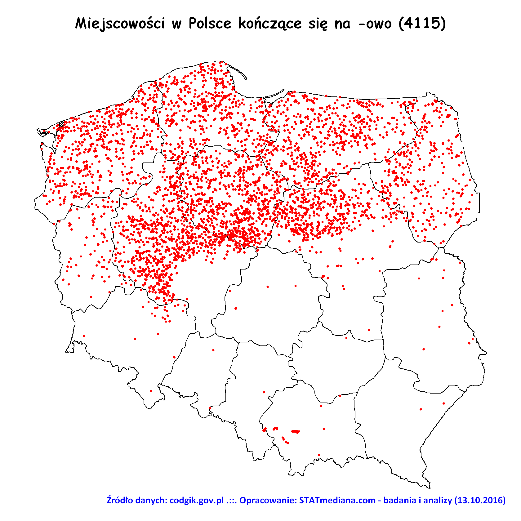 Miejscowości i miasta, których nazwy kończą się na owo ukazuje druga mapa. W tym przypadku mamy tendencję odwrotną - niemal wszystkie z końcówką owo występują na terytorium od środkowej do północnej Polski. W pozostałej części Polski nazewnictwo tego typu pojawia się bardzo rzadko - nie przekracza kilku, kilkunastu miejscowości w każdym z województw.