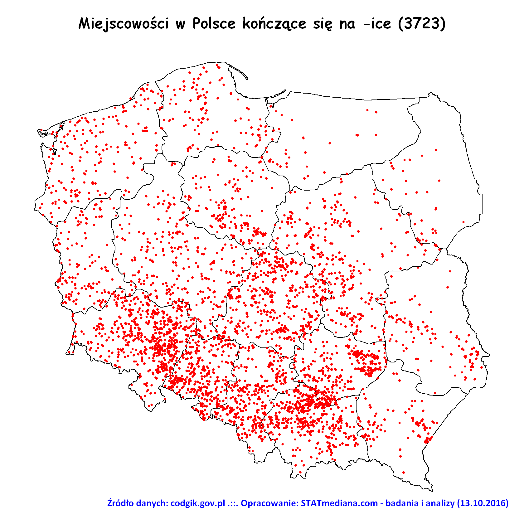 Miasta w Polsce kończące się na ów, owo, ice pokazaliśmy na trzech oddzielnych mapach. W zależności od końcówki nazwy (fachowo: sufiks) widać wyraźne tendencje usytuowania miast i wsi w Polsce. Można założyć, że zakończenia nazw miejscowości wiążą się z określonym rodzajem osadnictwa. Badacze tego zagadnienia już dawno udowodnili, że nazwy lokalne są charakterystyczne dla określonych faz osadnictwa. Na przykład, według Henryka Łowmiańskiego tzw. nazwy patronimiczne zakończone na ice, pochodzą z wieku VI-VII naszej ery. Zdaniem tego uczonego okolice zagęszczenia takich nazw są terenami osadniczymi zasiedlonymi przed VII wiekiem, kiedy występowały tzw. wspólnoty rodowe.